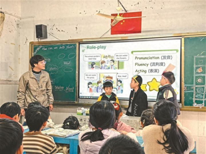 龙华支教老师在树下小学英语课上与学生互动。