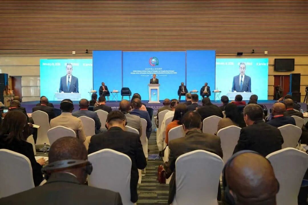 1月8日,2026年“中非人文交流年”开幕式在亚的斯亚贝巴非盟总部举行。中共中央政治局委员、外交部长王毅出席,宣读习近平主席贺信并作主旨发言,中非合作论坛非方共同主席国刚果(布)外长加科索、非盟委员会主席优素福、埃塞俄比亚总统塔耶先后致辞。图/外交部