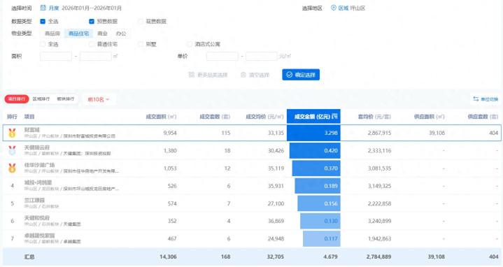 粤进深 赵盼盼2026年1月坪山区普通住宅预售项目网签金额排行榜出炉。