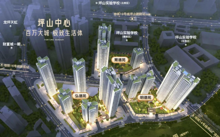 财富城位二期于坪山中心区金丰路旁,项目所在坪山最核心区域,前有半月环公园(规划中),旁边有坪山实验学校东校区、北校区和南校区,有地铁14/16号线在附近,还有地铁19号线(在建中)。