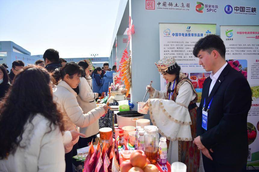 中国稀土集团展位前,定点帮扶县道孚县参展商正在介绍该县特色农产品。人民网记者 时雨摄