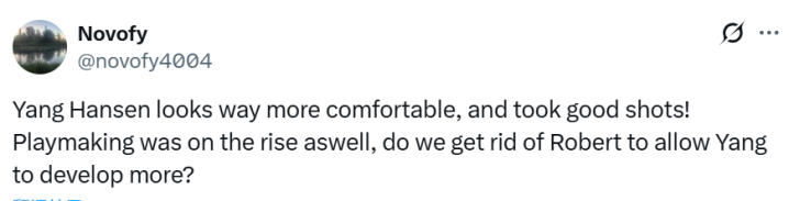 球迷novofy4004表示:“杨瀚森看起来比之前自在多了,投篮选择也很明智!他的策应能力也在提升,我们是不是该送走罗伯特(威廉姆斯),给杨瀚森更多成长空间?”