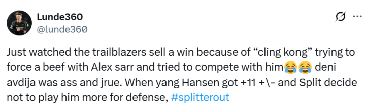 球迷lunde360写道:“刚看完比赛,开拓者简直是把胜利‘送’出去了!克林根和萨尔较劲,还想硬拼。阿夫迪亚和霍勒迪打得像坨屎。杨瀚森正负值都+11了,斯普利特(主教练)却以防守为理由不让他多打,#斯普利特下课。”